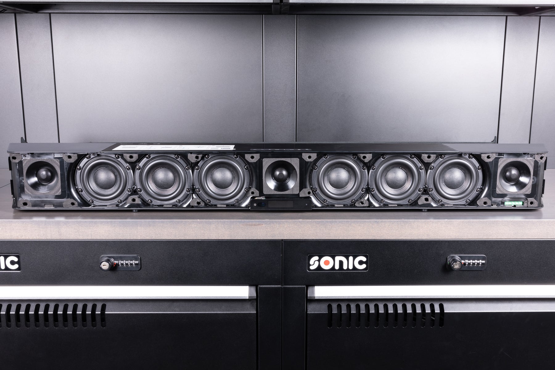 The look of this thing is perfection. It has a full aluminum cabinet finished in matte black. When you take off the front fabric cloth grill, you are presented with an impressive array of 13 drivers. These drivers help achieve Sennheiser’s Ambeo 3D technology, which develops a virtual rear surround sound audio field and an Atmos sound stage. It really is something to be experienced.